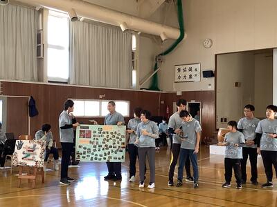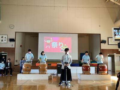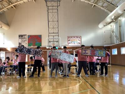3・4年生の「なんぽろ にんじゃがっこう」では、ニュース形式の進行に合わせて全員での校歌の合唱から始まり、忍者になるために楽器の合奏、マット運動などの修業を発表しました。最後は、鳴子を鳴らしながら「よさこいラーメン」の踊りを披露し、華やかに日頃の学習の成果を発表することができました。
