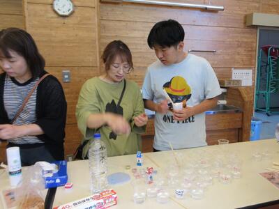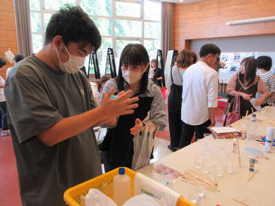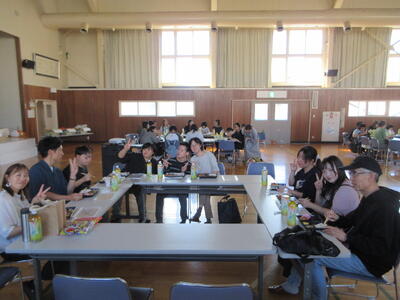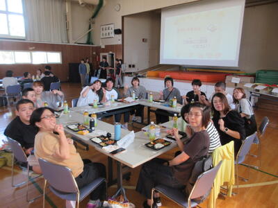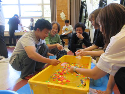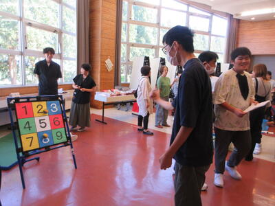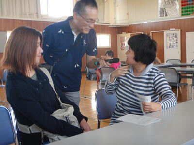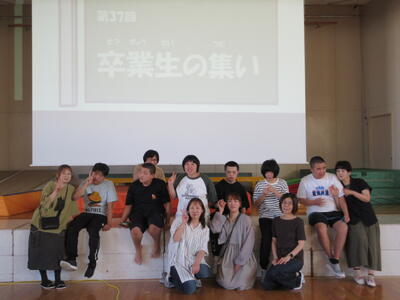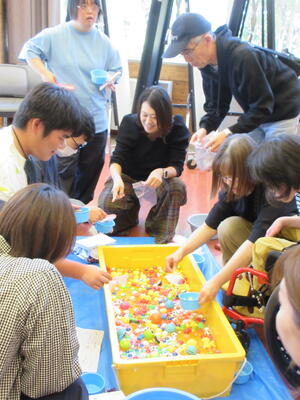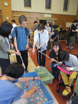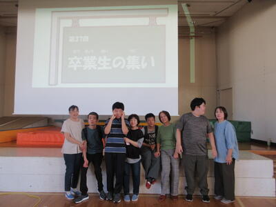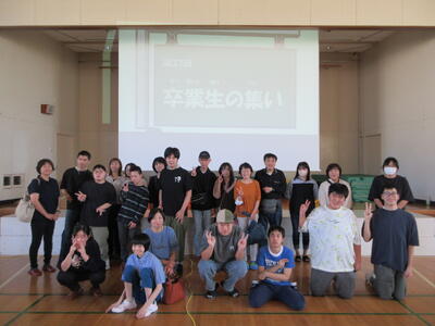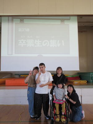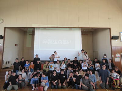 体育館で近況報告を行った後、多目的室に移動し、「縁日」で様々なゲームや体験を楽しみました。保護者さん中心に縁日の準備や担当を行うことで、保護者さん同士の交流の機会にもなりました。その後は、お弁当を食べながらの情報交換。 最後に記念撮影をして、会を閉じました。高等部卒業23回生は、最後の卒業生の集いとなりましたが、巡回で会えたときには、笑顔を見せてくれたらと思います。